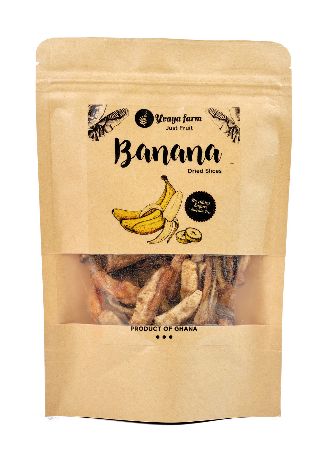Our Yvaya Farm Dried Bananas are grown in the magnificent Volta Region of Ghana, whose fertile lands are watered by the great Volta River. The local bananas from this area are squat, highly flavourful, and full of naturally occurring nutrients. Energy-packed and fibrous, this dried fruit is perfect as a snack before or after exercise, or whenever you need something to hold you over till your next meal.